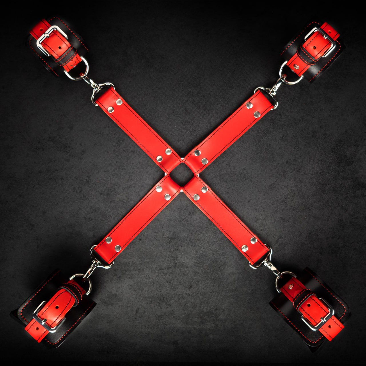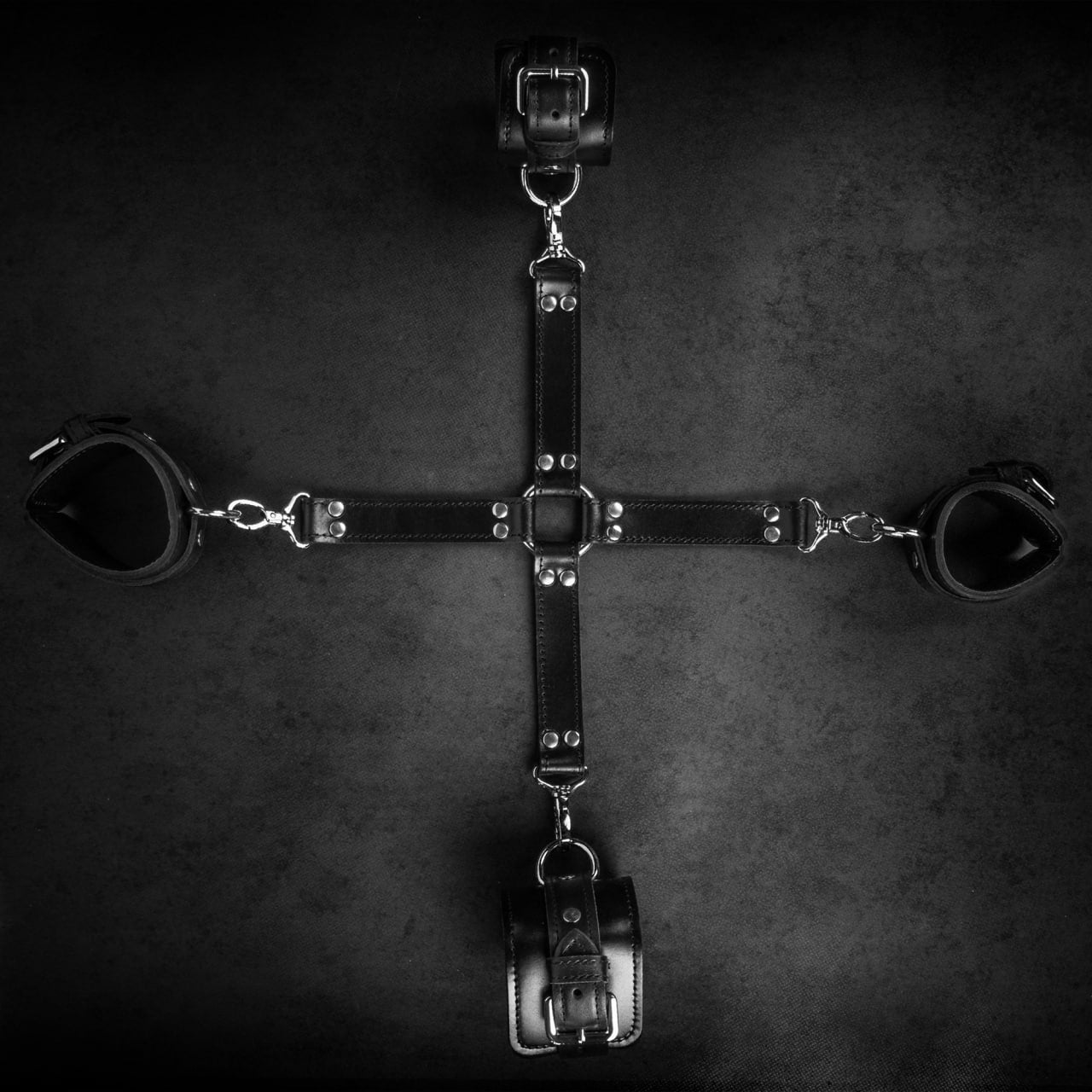 قطعة تقييد جريئة وعملية مصممة لتثبيت الأصفاد بإحكام على شكل صليب. مصنوعة من الجلد الفاخر، مما يضمن المتانة والراحة والمظهر الجذاب. مثالية لإنشاء نظام تحكم منظم ومحكم.