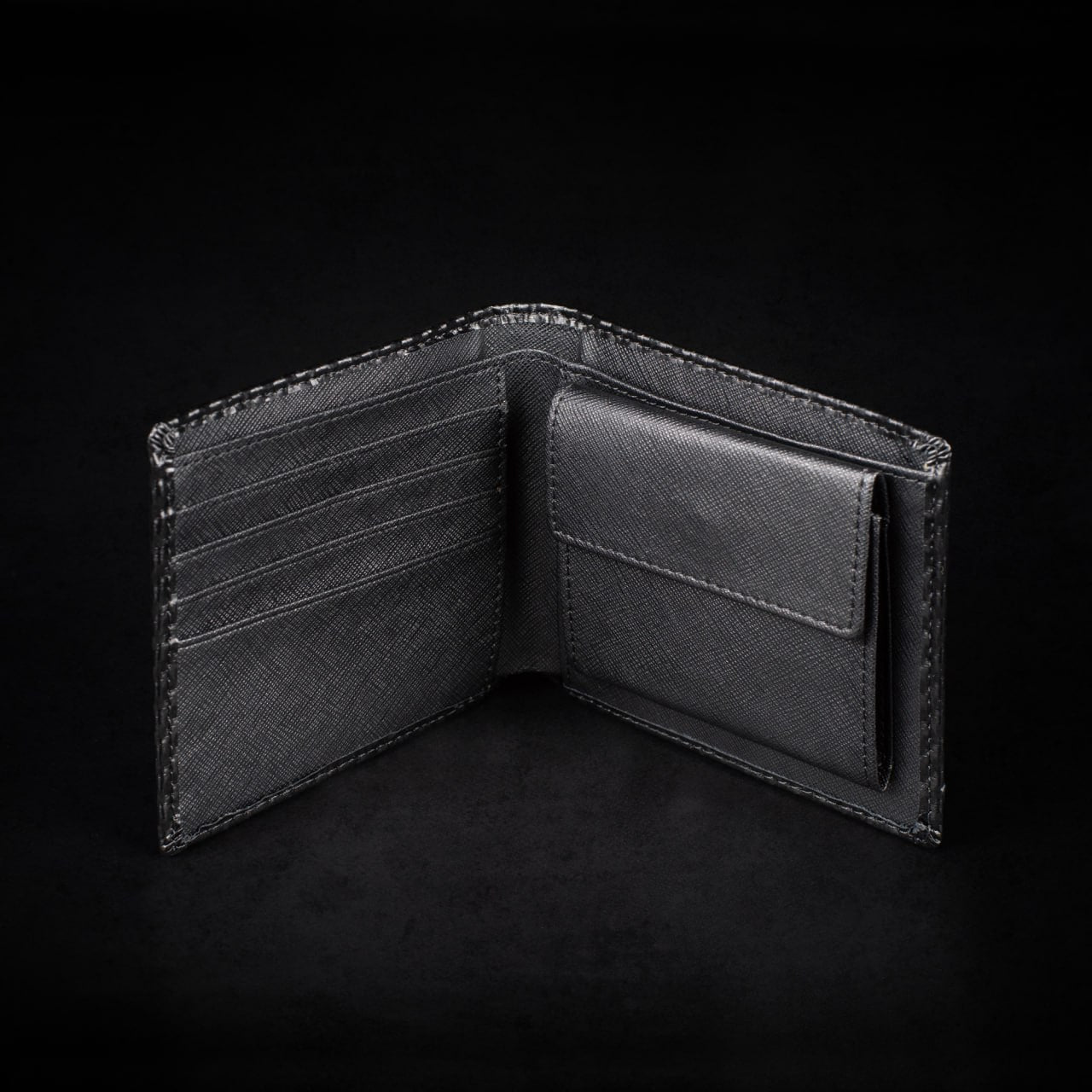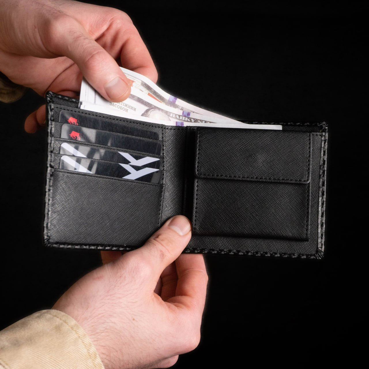 The Small Wallet model is made of cowhide leather of increased strength with a carbon finish.